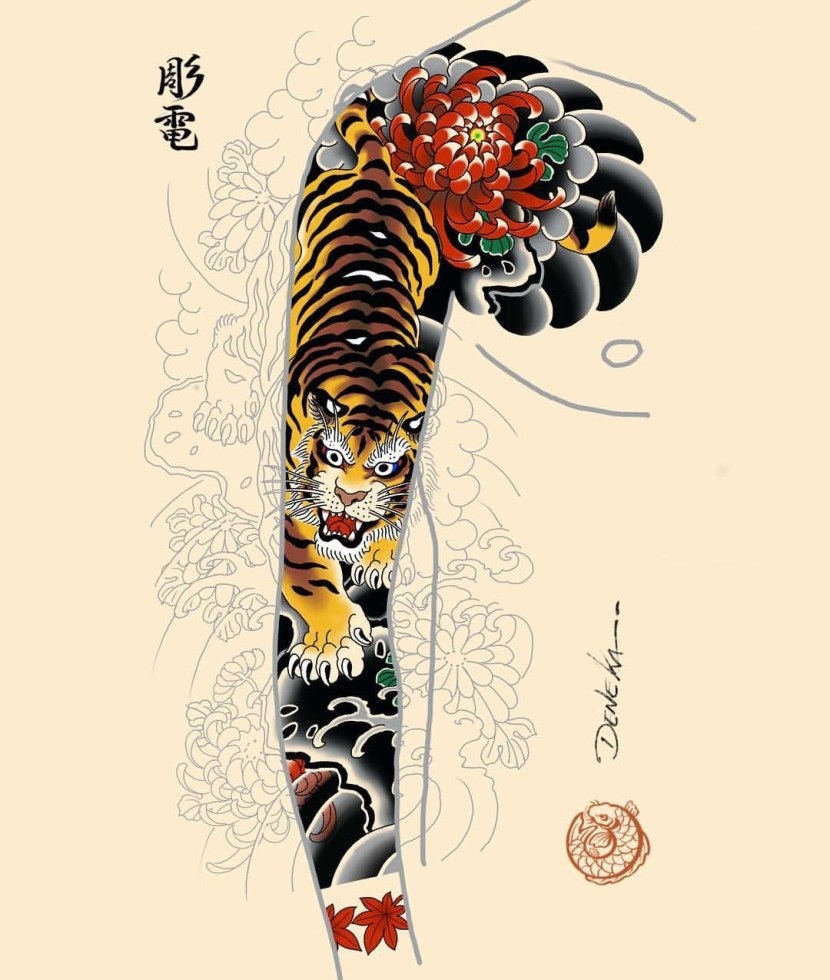 Tattoo sketch sleeve with a tiger yakudze